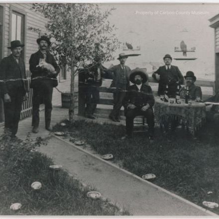 Two black & white print copies. Print of group of eight men. Two are standing beside a clapboard house, one holding a bright colored cat. Three men are leaning on the front of a board rail fence. Three men are seated at a table covered with fringe cloth. Setting the table are three large bottles, probably liquor, & drinking glasses. All men are dressed in suits & wearing hats, one a large sombrero, two are derbys, & a couple of cowboy hats. Two birdcages are hanging above the fence. There is a large bird in each one. A boardwalk is beside house & a dirt walk bordered with wood edges angles toward photo front. Grass is on either side of the walk. On the grass are round, concave unidentified objects. They line the walks. Men by fence stand on another boardwalk that leads to a clapboard building on photo right.