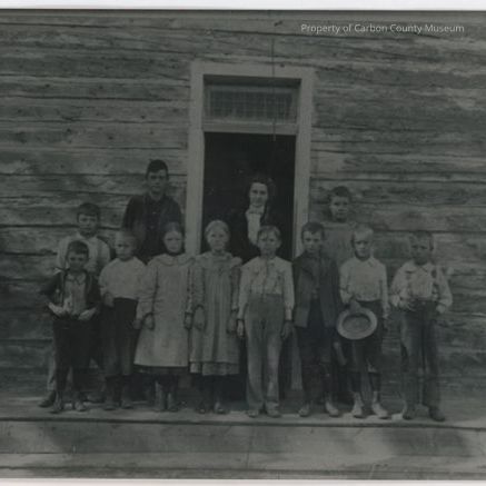 Written on back in black ink: "Miss Murcheson, Teacher, School house on Boberg Ranch. Brad Herman, Olga Boberg, Annie Boberg, Eddie Hamond[sic Hammond], Pete Shone[sic Schoen], Nellie Mourkin, Erving Carrol, Harry Hammond, John Boberg"