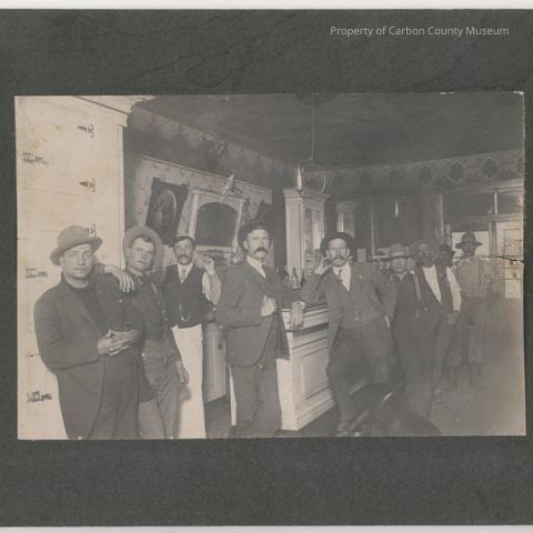 Written on back in blue ink: "Interior of a saloon in Dillon Wyo. about 1905 or 6" "Given by George Baker Encampment, Wyo."