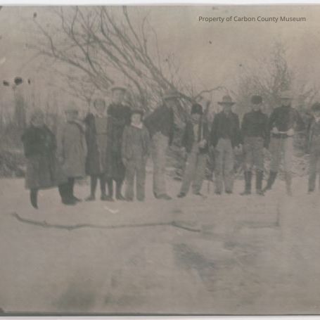 Two black & white copy prints of a group of 13 people standing in a line in the snow. All are dressed warmly with coats & hats. Barren trees are behind them.