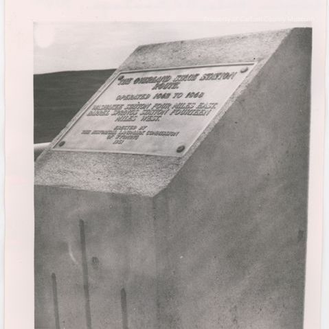 4.5" x 6 1/8" black and white print of a metal plaque on a slanted cement base marking an historical site. Embossed plaque reads: "Overland Stage Station Route/ Washakee Station 4 miles East/ Barrel Springs Station 14 miles west/ Erected by Historic Landmark Commission/ 1951." Written on the back of photo in bluish ink: No. 7, the Historical marker of the old Overland Emmigrant Trail between Walcott and Saratoga, WY.Collection