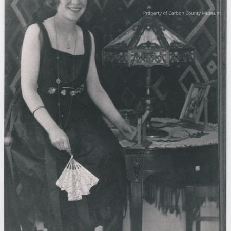 Black & white copy print of lady dressed in a sleeveless black chiffon dress. The dress has straps at shoulders, ribbon loops of same material from waist to hem line. She has two necklaces, one short with chain & pendent, the other very long with dangles. Her belt is ornate with decorations & she has on a band bracelet. She has on white shoes. She is leaning & sitting on a dining table & setting on the table is Tiffany shade lamp, a framed photo of people, a tilt mirror which she is holding with her left hand. Wall paper behind is large geometric, diamond design.