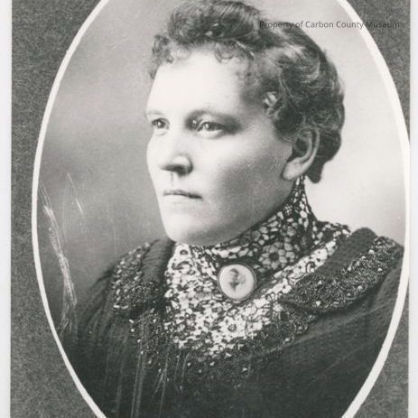 Black & white oval print & two scanned copies on green mat. Lady is dressed in dark dress with lace & bead overlay at neck & shoulders. A white high collar blouse is beneath. She has on a brooch with a mother & childs' picture. Embossed in lower right corner" "Brown Rawlins, Wyoming"
