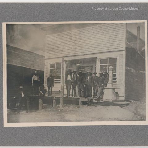 Update 1/2008: Black and white print. Mounted on grey matboard. Image of group of 11 men posed on a raised boardwalk in front of a clapboard building. Signs in windows: "Miners Exchange" "Baker's Place". Men are dressed in suits, casual suits and shirtsleeves. All are wearing hats. One man is on the street at left. Another building can be seen in background at left.