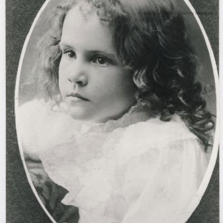 Black & white print on grey mat & two scanned copies. Image of young girl with dark, long curly hair. She is wearing a white dress with pouffy sleeves, wide collar & lace bow in front. Embossed on bottom right corner: "Brown" "Rawlins Wyoming".