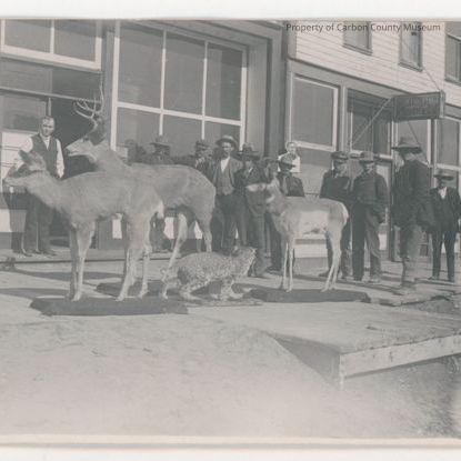 People standing in front of Baker's Saloon at Encampment, 1911-1912 with trophy animals lined up on the sidewalk. George Baker is in doorway.