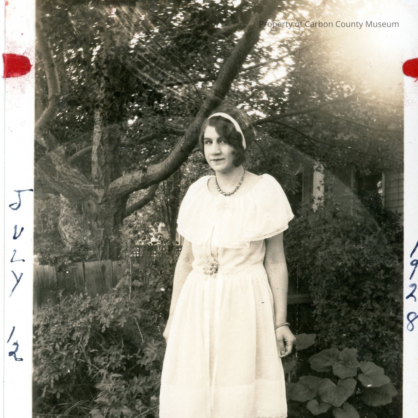 Black and white photograph. A woman wearing a white dress is standing beside a tree and other vegetation in a yard. Written along the top edge of the photograph is "RAWLINS", along the bottom edge "DOLORES EMICH", vertically along the left edge "JULY 12", and vertically along the right edge "1928". Printed on the reverse is the number 25.Collection