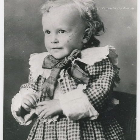 Black & white print on cream mat & 2 scanned copies. Image of a young boy with curly blond hair wearing a checkered dress with white collar & cuffs & a large bow tied at neck. Written beneath print: "Leo Brown" Engraved on bottom: "Brown Rawlins, Wyo."
