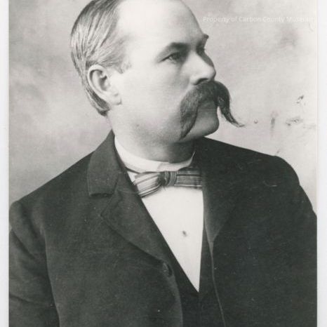 Black & white print on black mat & two copy prints. Image of a man with high forehead & full waxed mustache. He is wearing a black jacket & vest with striped bow tie & white shirt. There is a watch fob & chain attached to his vest. Embossed in white on bottom: "Brown Rawlins Wyoming"