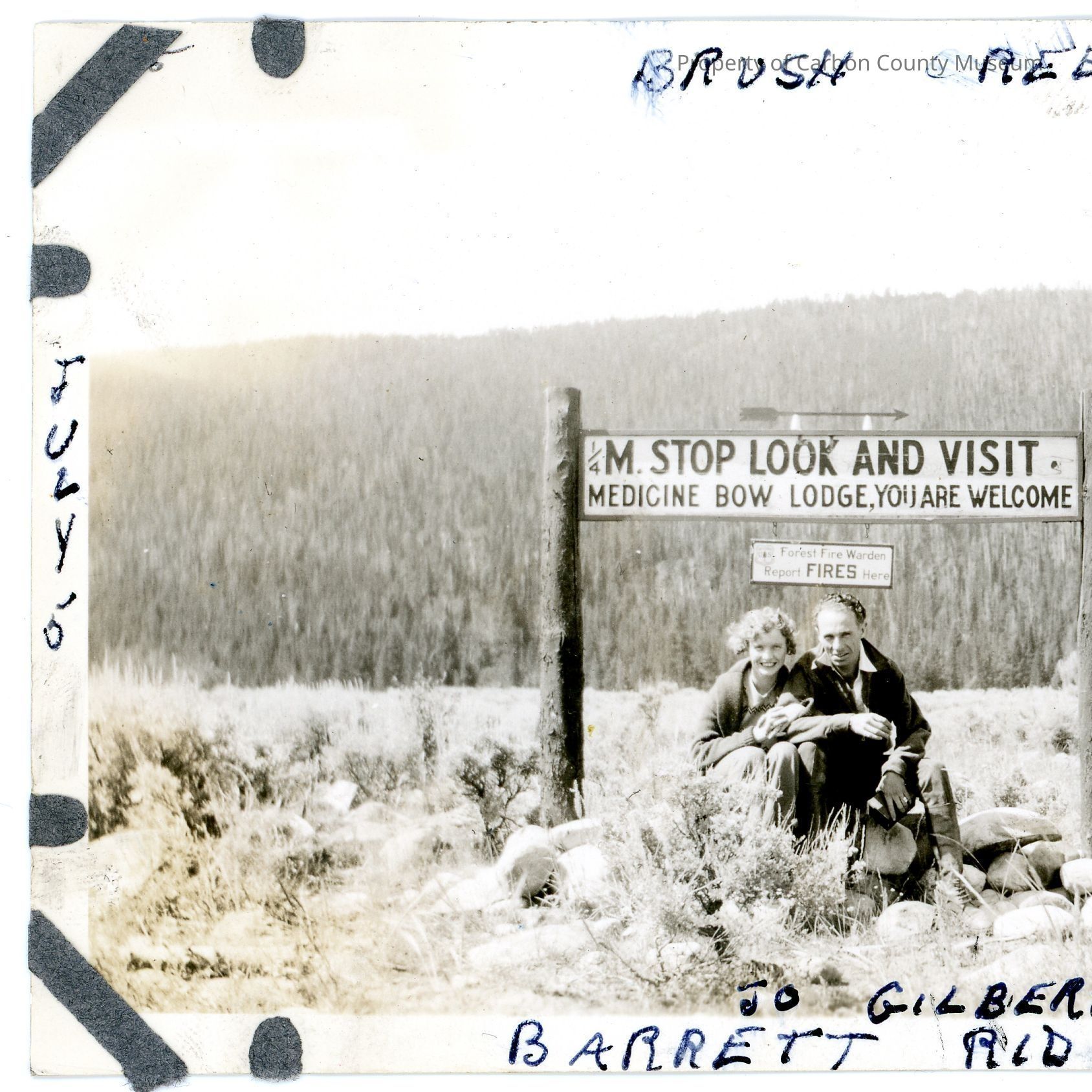 Black and white photograph. A woman (JO) and a man (GILBERT) are sitting underneath a sign that reads "1/4 M. STOP LOOK AND VISIT. MEDICINE BOW LODGE, YOU ARE WELCOME". A smaller sign hung underneath the first reads "FOREST FIRE WARDEN REPORT FIRES HERE". A mountain covered in trees is visible in the background. Along the top of the photograph is written "BRUSH CREEK", along the bottom "BARRET RIDGE", vertically along the left "JULY 5", vertically along the right "1934". The number 164 is printed on the reverse.Collection