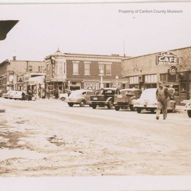 4 9/16" x 2 3/4" black and white photograph. Picture shows the area around 4th and Front Streets, Rawlins. To the very left is the train station/depot building. The ground around it is wet/has puddles. Across the street a row of cars and trucks are parked outside businesses. The furthest east building is the Palace Cafe. Across 4th street, at 401 Front St., is the Luxus Cafe, with a sort of second floor turret. Further along were the Green Mill, a taxi place, and a hotel.