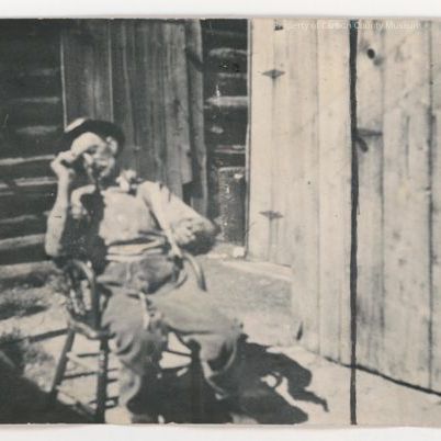 Update 2009: Black and white print. Photo of an elderly man sitting in a chair outside a log house in the sun, sleeping. He is resting his head on his right hand. He has on a cap. Man in casual dress.