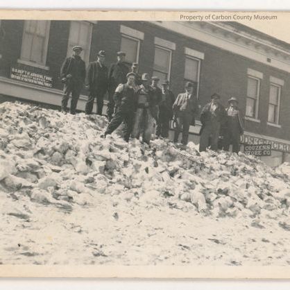 Update 2009: Black and white postcard. Photo of 11 men standing on top of a big snow pile. Business building can be seen in the background. All you can see is the tip of the main floor and the second story of the building. Business on the right you can see "Groceries and Hardware" a sign hanging on the front of this business reads: Couzer' Store Co." The building to the left has a sign on bottom of second story which reads, "U.S. Dept. of Agriculture-Forrest Service-Office of Hayden National Forest". The three men standing in front and to the right have on business suits. the other 8 men are dressed in work clothes, casual.