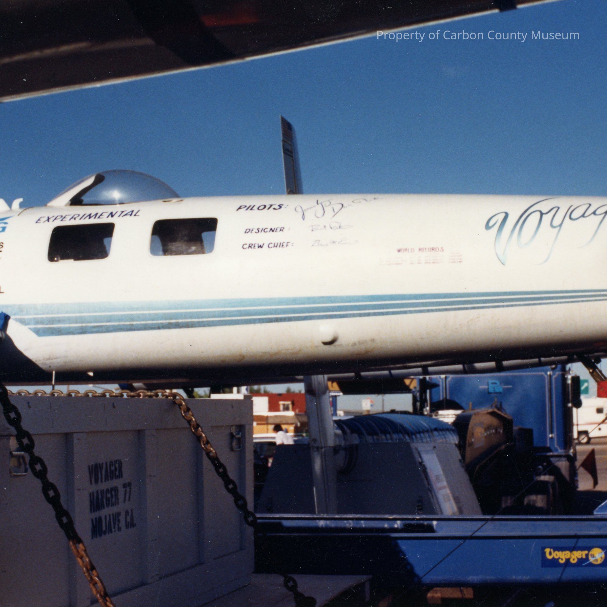 4 7/8" x 3 1/2" color photograph of the Voyager - the first plane to make it around the earth without refueling. Plane was on a truck to be brought to the Smithsonian, and drove through Rawlins.