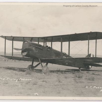 Black & white print card of bi-wing airplane. Plane is sitting in a grassy field & propeller appears to be in motion. Printed in white on bottom on original negative: "The Flying Parson" "H. H. Rogner, Photo Rawlins, Wyo."