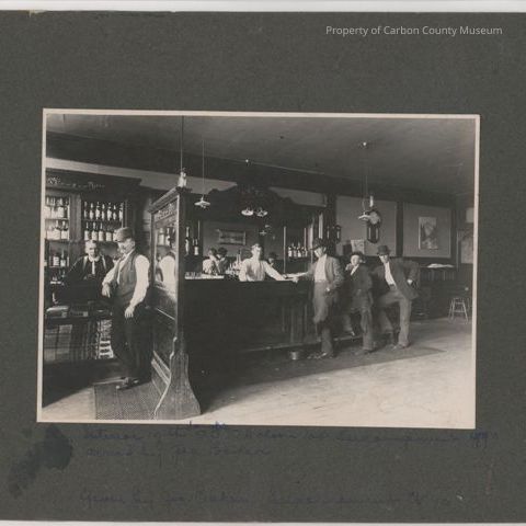 Written under photo on bottom section of matboard in blue ink: "Interior of the Double OO Saloon in Encampment, Wyo. Owned by Geo. Baker." "Given by Geo. Baker-Encampment, Wyo".