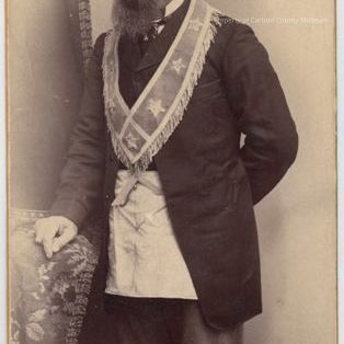 Black & white print on cream mat of a standing man in a uniform of an organization. He has dark suit jacket & pants. A "V" sash is around his neck & hangs to his waist. It is decorated with stars & has fringe on the edge. There is a short white apron around his waist with a ribbon. in inverted "V" shape pinned to waist. He has dark hair parted on the left & a full beard & mustache. His right hand rests on the back of a floral print chair. Written on bottom: "E. F. Cheney Grand Master Oct 14/84 to Dec 1/85" Printed on bottom in gold: "Baker & Johnston Evanston, Wyo" Edged in gold.