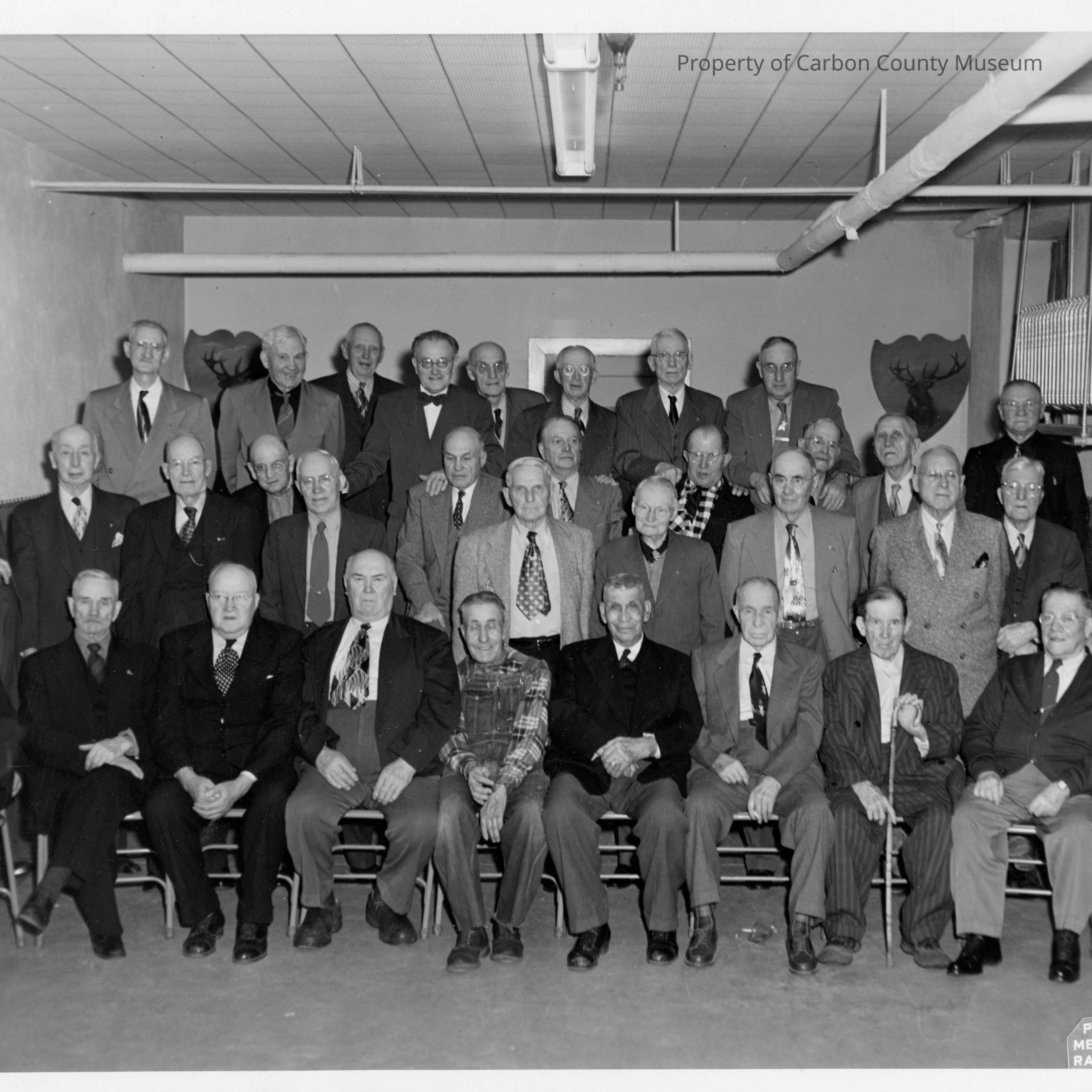 9 7/8" x 8" black and white photograph of the Over 70 Club. 3 (uneven) rows of men, first row seated, second standing, third standing on something raised. Room is possibly in a basement, as there are pipes suspended from the ceiling.