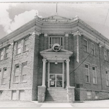 Black & white copy print of multi level stone building. Front steps on corner of building lead to double glass doors. A pillar is on each side of doors. A masonic emblem of sword through a circle above a star is above crown molding held up by pillars. Sides of the building have a lot of windows in pairs. Crown molding is around top of building & at top corner is engraved: "1909 Masonic Temple"