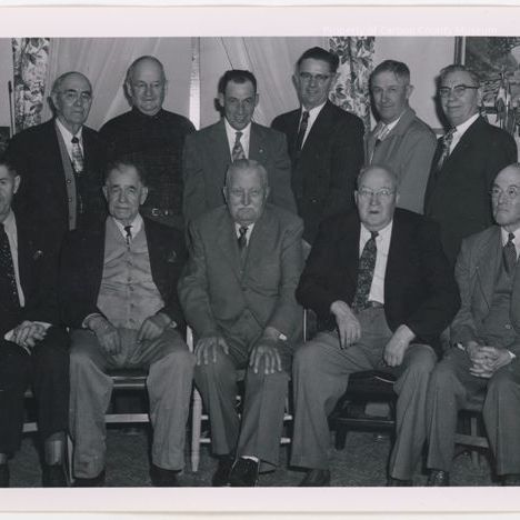 Black & white glossy print of a group of 11 men. The front row of five men are seated. The all wear suits. The back row is standing & there are six men all wearing suits.