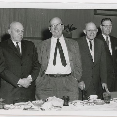 Black & white glossy print of four men standing behind a table set with dishes & food. Men are dressed in suits.