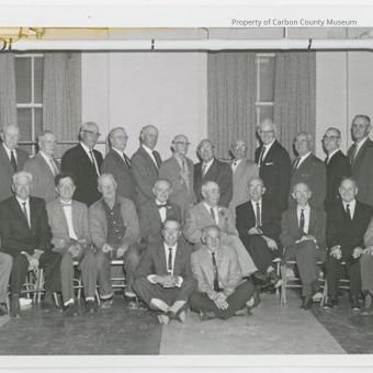Black &white glossy print of a group of men sitting & standing in three rows. Two men are sitting on the floor in front. Eleven men are sitting on folding chairs in the second row. The third row is standing & there are seventeen men. All are wearing suits.