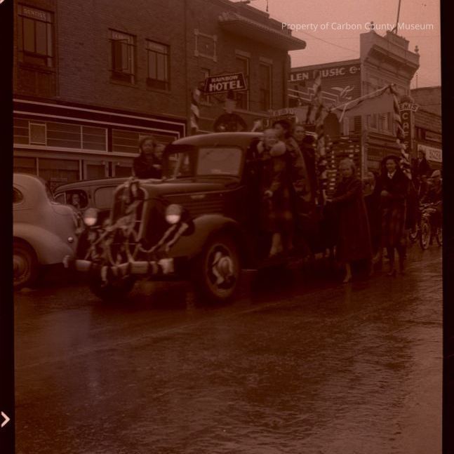 Image shows a parade going past the Rainbow Hotel on Cedar St. Women walk next to or stand on the running board of a truck. It is unclear what the display in the bed of the truck is. Streamers cover the front of the truck. Cars are parked on the side of the street between the parade and the buildings they pass. Behind the truck bicyclists can just be made out.Collection