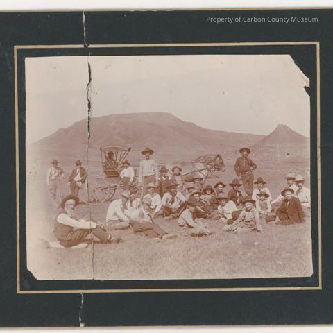 Update 1/2008: Sepia print. Mounted on black matboard with thin engraved "frame" around image. Image of a group of men and boys on the prairie. Most are seated on the ground, five are standing with one leaning on a shovel. There is a horse and buggy behind the group with a single man in the buggy. Low hills can be seen in the background. The group is variously dressed from shirtsleeves to suits and ties. All are wearing hats.