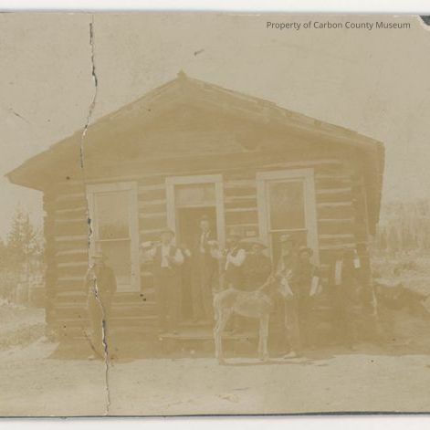 Update 2008: Sepia print. Snapshot. Mounted on grey matboard. Image of 8 men and a donkey? colt in front of a log building set on an open dirt area with trees and mountains in the background. Men are casually dressed. Three are holding what appears to be liquor bottles. A 9th man is lounging on the ground in the shade along right wall of building. Rump of a horse or mule at right side.