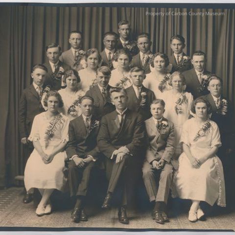 Approx. 10" x 8" black and white photograph. Person on left in second row from back, the row with 4 young men, is donor's wife's grandfather, Emanuel Richard "Dick" Foss. Foss was born on a farm around Walsenburg, CO in 1908. This picture was taken in 1920 at his confirmation into the Lutheran church. He went on to live in Carbon County for 74 years, and acted as the agent for UPRR in Hanna, WY before and during WWII. Foss's son, Robert (Bob) Helton owned a Conoco station in Rawlins, and was Melodi Roy's father.