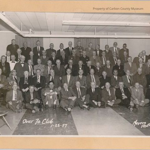 Black & white glossy print on cream mat. Five rows of men sitting & standing. First row is sitting on the floor, second row is seated on chairs, third, fourth & fifth rows are standing one row above another. Printed in white on bottom on original negative: "Over 70 Club 1-28-57 Meyers Photo"