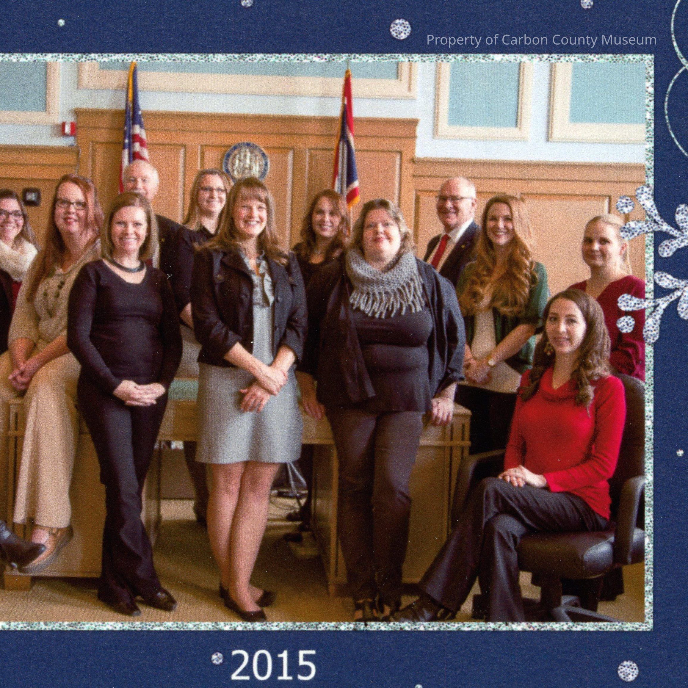 Picture card sent to the Museum by the Carbon County Attorney's Office for the 2015 holidays. Image shows 11 women and 2 men standing and sitting, apparently, in a courtroom. Around the photograph is a blue background with snowflakes, and the text: "Happy Holidays; The Carbon County Attorney's Office; From left to right: Cindy Burkhart, Sarah Chavez, Rae Jones, Holly Law, Michael Kelly, Ashley Mayfield Davis, Ava Bell, Dawnessa Snyder, Joanna Rieger, Cal Rerucha, Mary McAllister, Jacqueline Bowlus, and Sara Miles. Paid for by Cal Rerucha"
