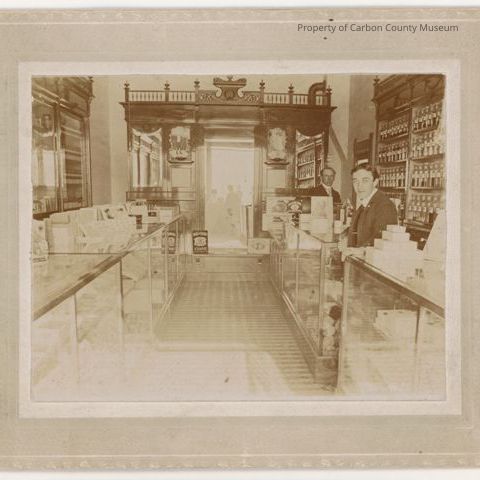 Interior of a Drug Store at Ft. Steele. Mr. Sager was a druggist before he came to Ft. Steele for his health.