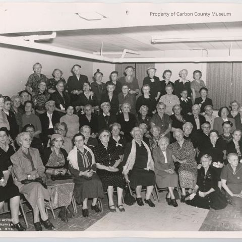 Black & white glossy print of six rows of well dressed women. Two women are sitting on the floor & next two rows are seated. The last three rows are standing one row above another. In white on bottom left corner: "Frank J Meyers Photographer Rawlins, Wyo"