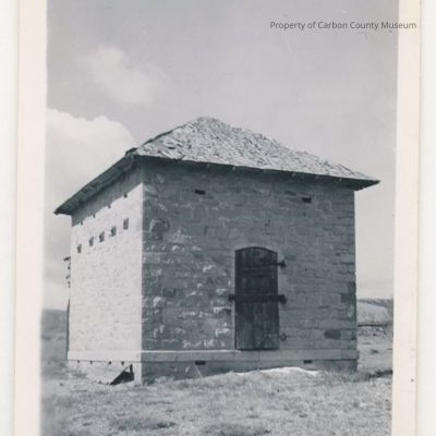 Written on back in blue ink: "The old Powder House at Fort Fred Steele, Wyo. Still standing & in very good repair in 1956. Given by Mrs. Dwight Sager Ft.. Steele, Wyo."