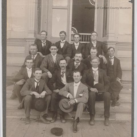 Black & white print on a black mat of a group of fourteen men sitting on the steps in front of a store front. All the men are nicely dressed in suits & ties & many are holding their hats & a cigar in their hands. A hat is laying on the boardwalk in front of them. The boardwalk leads up to the wood steps leading to a single door. The entry has a solid window panel on photo left & door has a screen. There are wood spindles across the middle & in top right & bottom left corners of top portion are quarter curve spindle wagon wheel shaped wood decorations. Entryway is set back into building & crown molding & decorative cut wood frames windows in entry & the front of the building.