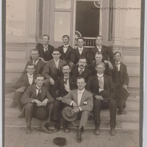 Black & white print on a black mat of a group of fourteen men sitting on the steps in front of a store front. All the men are nicely dressed in suits & ties & many are holding their hats & a cigar in their hands. A hat is laying on the boardwalk in front of them. The boardwalk leads up to the wood steps leading to a single door. The entry has a solid window panel on photo left & door has a screen. There are wood spindles across the middle & in top right & bottom left corners of top portion are quarter curve spindle wagon wheel shaped wood decorations. Entryway is set back into building & crown molding & decorative cut wood frames windows in entry & the front of the building.