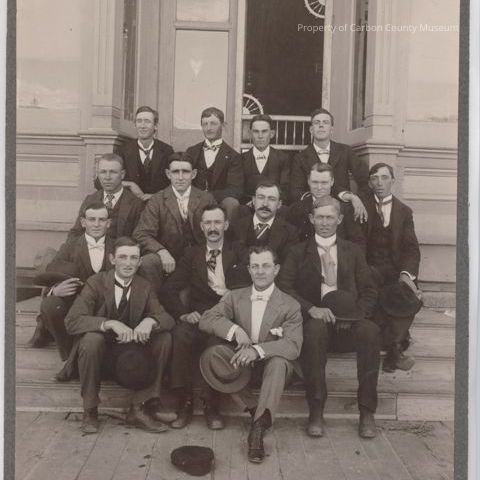 Black & white print on a black mat of a group of fourteen men sitting on the steps in front of a store front. All the men are nicely dressed in suits & ties & many are holding their hats & a cigar in their hands. A hat is laying on the boardwalk in front of them. The boardwalk leads up to the wood steps leading to a single door. The entry has a solid window panel on photo left & door has a screen. There are wood spindles across the middle & in top right & bottom left corners of top portion are quarter curve spindle wagon wheel shaped wood decorations. Entryway is set back into building & crown molding & decorative cut wood frames windows in entry & the front of the building.