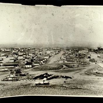 Update - 2009. Black & white print of early day, birds eye view of Rawlins. Print taken looking east from monument hill. There is a wagon encampment in foreground, area was called Wagon Park. Streets of Front, Cedar, Buffalo & Pine are seen in print interspersed with houses, businesses, church & railroad yards.