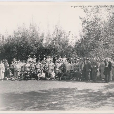 Black & white glossy print of nicely dressed men & women. The are outside, mostly standing & some are holding plates & eating. Fourteen men & one woman, kneeling, are on ground in front row. Three rows are behind them & some people are standing on photo right under a tree & they are looking away from photographer. Trees are behind them & grass is in foreground. Most have a ribbon badge pinned on left chest.