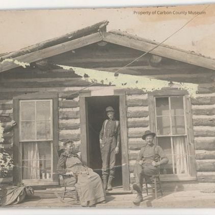 Black & white print on black mat. Image of log & stucco cabin with woman sitting in a wood rocker & man sitting in a wood straight chair. One boy stands in the doorway of cabin & another boy is at photo left corner of cabin with his left arm on window frame. Lady is wearing a print blouse with a striped long dress. Man is wearing a striped shirt, dark pants, lace up boots, dark hat & suspenders. Boy in doorway is wearing dark shirt, pants, hat & light colored suspenders. Boy on corner is wearing dark slacks, light shirt, hat & suspenders. Cabin has a window on both sides of th door with lace curtains. Pole roof is uneven at center.