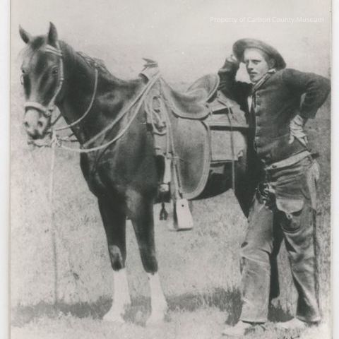 Black & white print of cowboy leaning on his horse. A dark horse with white lower legs stands, saddled & bridled with lead rope hanging under chin. The man is dressed in a dark jacket, hat, gloves & chaps with a pocket on left leg. His right arm bent at the elbow is on horse behind the saddle with hand on his head. Printed on bottom in black: "Fort Bridger, Wyoming to Hugh Cooke"