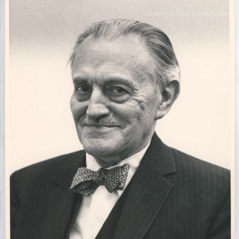 Update March 2011: Black & white print of an elderly man. His hair is greying & receding & he has a small mustache. He wears a print bow tie, a white shirt & a dark suit jacket with thin stripes. He is smiling.