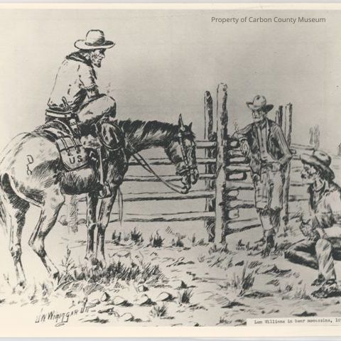 Black & white print photo of a drawing. Image of a man on horseback with his right leg crossed over neck of horse. He has on a flat, wide brimmed hat, a large knife stuck on his belt, & there is a canteen & bag behind his saddle that reads: "U S". Another man leans against a pole fence & holds a smoke in his right hand. Another man squats on the ground & holds a pipe. Printed on bottom left in black: "J. W. Wigingar Jr." & a drawing of a pistol. Typed on bottom right on original negative: "Lum Williams in bear mocassins, 1873 or 1874"