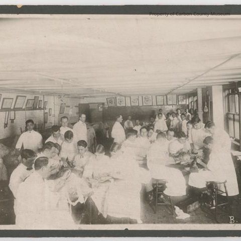 Update March 2011: Black & white print on black mat. Image of a class room of young men dressed in white lab coats. They are in groups around several tables & some are standing. On photo right a body is laying on the table & young men's hands are on the body. Windows are on photo right & pictures are near the top of the classroom on shelves.