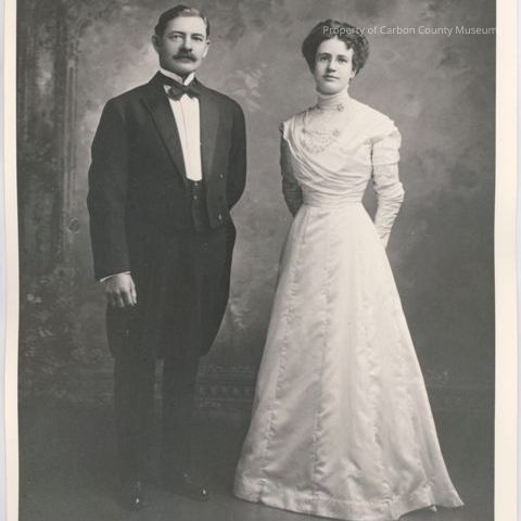 Black & white print & one copy of standing man & woman. They are dressed in possible wedding clothes. He is wearing a dark suit, vest, pants, bow tie & white shirt. He has dark hair parted on the left & a full mustache. She is wearing a long satin gown. It has a high neck with lace trim & a brooch. Bodice is a crossover of fabric & she has on a beaded multi strand necklace. The sleeves are long & fitted & the skirt flows in "A" line pattern in panels to the floor.