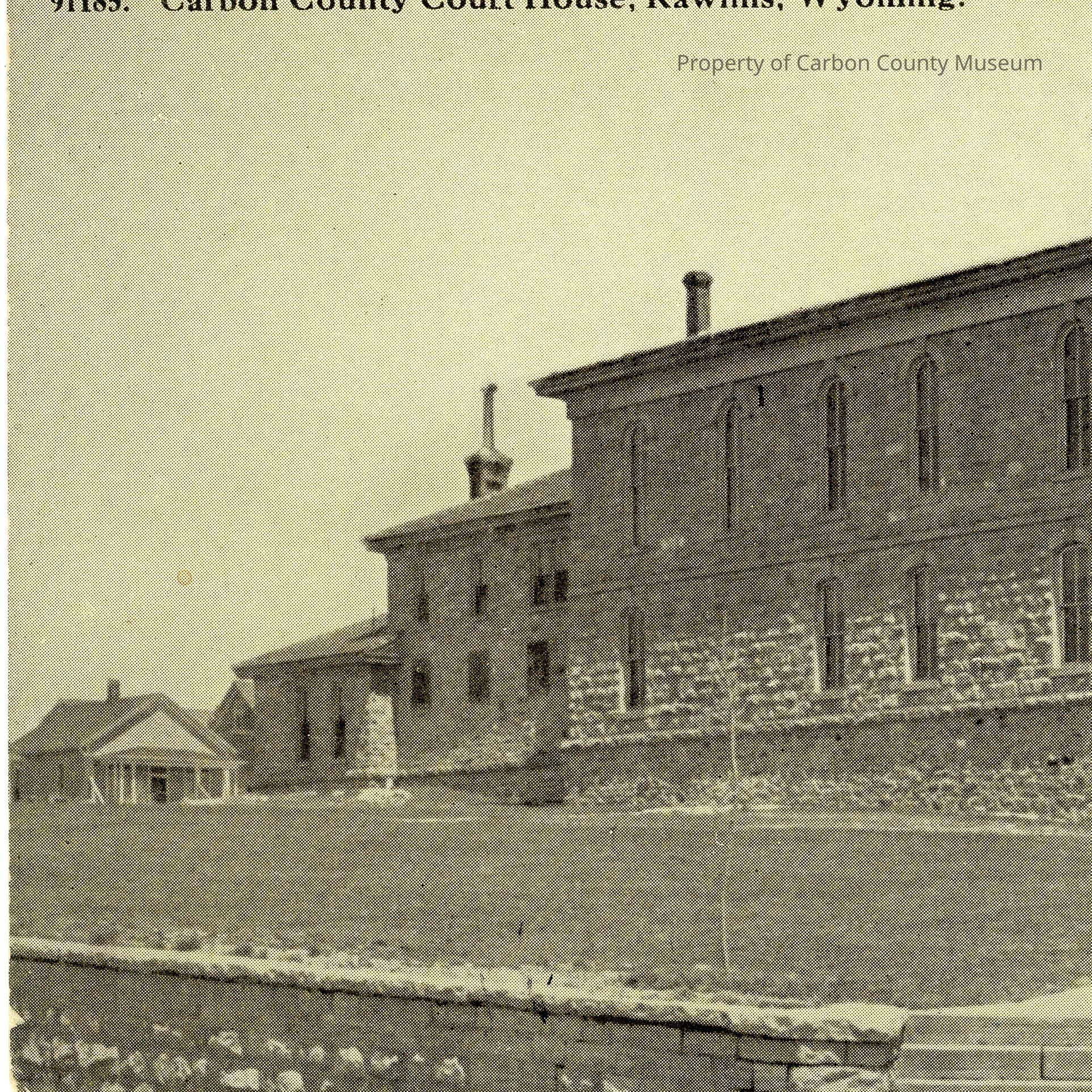 Postcard featuring a sepia tone photograph of the old Carbon County Court House, several people are standing at the building's entrance. Black text along the top left corner of the postcard reads "91185. Carbon County Court House, Rawlins, Wyoming." On the reverse is a designated space for a postage stamp and text that reads "THIS SPACE FOR MESSAGE", "POST CARD", and "ADDRESS".Collection