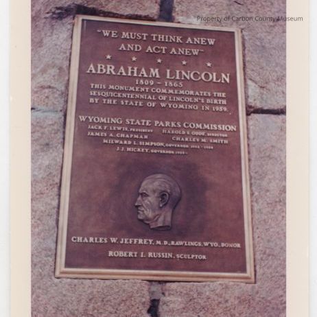 Update March 2011: Color snapshot print of a bronze looking plaque with a quote from Abraham Lincoln (1809-1865) embossed at the top: "We must think anew and act anew" The monument on which the plaque is attached is to commemorate the sesquicentennial of Lincoln's birth (150 years). At the bottom of the plaque: "Charles W. Jeffrey, M D Rawlings [sic Rawlins].