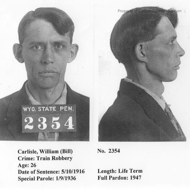 Two black & white prints of mug shot of Bill Carlisle. Photo on left is face forward & photo on right he is looking to photo right. Number "2354" is on a card beneath his chin on forward looking picture. He wears a dark jacket, striped shirt & print tie. Printed on left" Carlisle, William (Bill) Crime: train robbery Age: 26 Date of Sentence: 5/10/1916 Special parole: 1/19/1936" Printed on bottom right: "No 2354 Length: Life Term full pardon: 1947"
