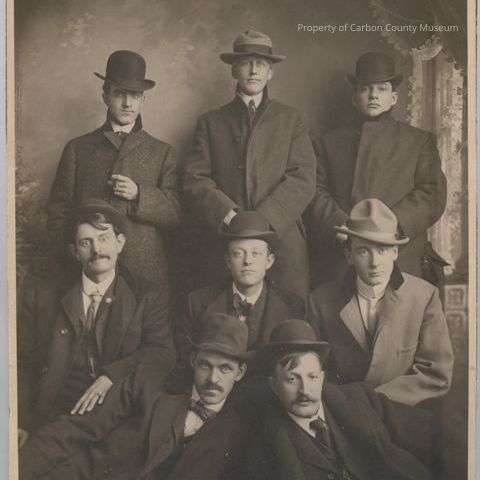 Black & white studio portrait on black mat. Image of eight men dressed in coats, suits & ties. They all wear hats of varying styles. Backdrop is a studio prop of floral drape.
